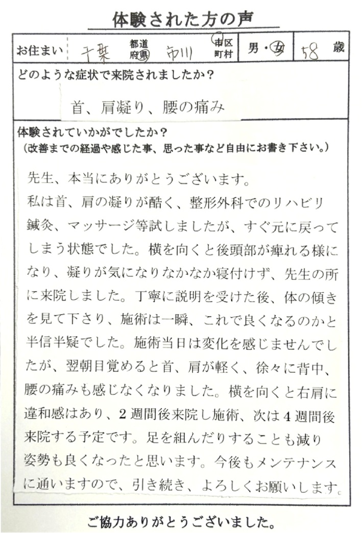 施術当日は変化を感じませんでしたが、翌朝目覚めると首、肩が軽く、徐々に背中、腰の痛みも感じなくなりました。